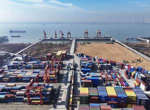 (260114) -- BEIJING, 14 enero, 2026 (Xinhua) -- Vista aérea tomada con un dron el 14 de enero de 2026 de grúas pórtico transportando contenedores en una terminal de contenedores del puerto de Taizhou, en Taizhou, en la provincia de Jiangsu, en el este de China. El año pasado, el valor del comercio exterior de China alcanzó los 45,47 billones de yuanes (alrededor de 6,48 billones de dólares), un aumento interanual del 3,8 por ciento, según datos publicados por la Administración General de Aduanas el miércoles. Esto marca el noveno año consecutivo de crecimiento del comercio exterior de China desde 2017. (Xinhua/Gu Jihong) (ah) (ra) (vf)