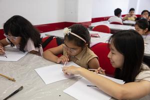 (260114) -- LIMA, 14 enero, 2026 (Xinhua) -- Imagen del 13 de enero de 2026 de una profesora (d) impartiendo una lección de pintura a estudiantes durante los denominados "Talleres de verano 2026" organizados por el Instituto Confucio (IC) de la Pontificia Universidad Católica del Perú (PUCP), en Lima, Perú. Niños peruanos participan muy emocionados durante este verano en los talleres organizados por el IC de la PUCP para lograr y consolidar su acercamiento a la cultura china mediante actividades educativas y recreativas. (Xinhua/Mariana Bazo) (mb) (ah) (ra) (vf)
