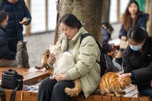 (260115) — CHONGQING, 15 enero, 2026 (Xinhua) — Imagen del 14 de enero de 2026 de visitantes interactuando con gatos en un parque temático de gatos, en el distrito de Nan’an, en Chongqing, en el suroeste de China. Desde 2025, un terreno baldío a lo largo del río Yangtsé, en el distrito de Nan’an de Chongqing, se ha transformado en un parque temático de gatos. Con una superficie de 30.000 metros cuadrados, el parque sirve como refugio para gatos callejeros abandonados o heridos. (Xinhua/Huang Wei) (da) (ra) (vf)