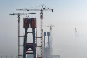 (260116) — HAIYAN, 16 enero, 2026 (Xinhua) — Imagen tomada con un dron el 16 de enero de 2026 de la torre principal No. 8 ya coronada (i) del puente del canal de navegación norte a lo largo del Puente Ferroviario Transmarino de la Bahía de Hangzhou, en la provincia de Zhejiang, en el este de China. La torre principal No. 8 de 200 metros de altura del puente del canal de navegación norte a lo largo del Puente Ferroviario Transmarino de la Bahía de Hangzhou fue coronada el viernes. (Xinhua/Huang Zongzhi) (jg) (da) (vf)