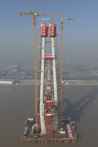 (260116) -- HAIYAN, 16 enero, 2026 (Xinhua) -- Imagen tomada con un dron el 16 de enero de 2026 de la torre principal No. 8 del puente del canal de navegación norte a lo largo del Puente Ferroviario Transmarino de la Bahía de Hangzhou, en la provincia de Zhejiang, en el este de China. La torre principal No. 8 de 200 metros de altura del puente del canal de navegación norte a lo largo del Puente Ferroviario Transmarino de la Bahía de Hangzhou fue coronada el viernes. (Xinhua/Huang Zongzhi) (jg) (da) (vf)