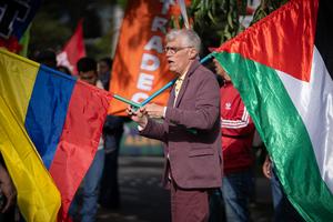 (260116) -- BOGOTA, 16 enero, 2026 (Xinhua) -- Imagen del 15 de enero de 2026 de un hombre sosteniendo banderas de Colombia y Palestina mientras participa en una manifestación frente a la Embajada de Estados Unidos, en Bogotá, capital de Colombia. Al menos un centenar de ciudadanos colombianos se manifestaron el jueves frente a la Embajada de Estados Unidos en Bogotá, la capital colombiana, para rechazar la injerencia de ese país en Latinoamérica, especialmente las acciones militares del pasado 3 de enero en Caracas y la captura del presidente venezolano, Nicolás Maduro. (Xinhua/Andrés Moreno) (am) (oa) (ra) (vf)