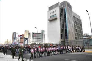 (260116) - LA HABANA, 16 enero, 2026 (Xinhua) -- Miembros de las fuerzas armadas de Cuba y ciudadanos marchan frente a la Embajada de Estados Unidos, en La Habana, capital de Cuba, el 16 de enero de 2026. Medio millón de cubanos marcharon el viernes frente a la Tribuna Antiimperialista y muy cerca de la embajada estadounidense en La Habana, la capital de la isla, como parte de un homenaje a los 32 militares fallecidos en el ataque de Estados Unidos contra Venezuela el pasado 3 de enero. (Xinhua/Joaquín Hernández) (jh) (oa) (ra) (vf)