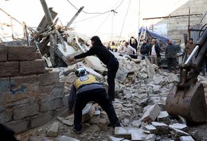 (260117) -- DOUMA, 17 enero, 2026 (Xinhua) -- Imagen del 16 de enero de 2026 de rescatistas retirando los escombros de un edificio residencial de dos pisos colapsado, en la ciudad de Douma, cerca de Damasco, Siria. (Xinhua/Str) (oa) (da)
