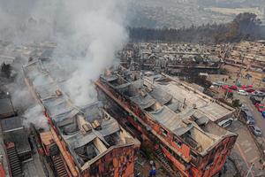(260119) -- BIOBIO, 19 enero, 2026 (Xinhua) -- Imagen tomada con un dron cedida por la Agencia de Noticias de Chile AGENCIA UNO de un edificio residencial destruido después de los incendios, en el Cerro La Huasca, en Lirquén, en la comuna de Penco, en la región del BioBío, Chile, el 19 de enero de 2026. (Xinhua/Rodrigo Fuica/AGENCIAUNO) (rtg) (ah)