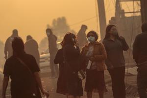 (260118) -- BIOBIO, 18 enero, 2026 (Xinhua) -- Personas reaccionan después un incendio forestal, en Lirquén, en la comuna de Penco, en la región del Biobío, Chile, el 18 de enero de 2026. El presidente de Chile, Gabriel Boric, declaró el domingo estado de catástrofe en las regiones de Ñuble y Biobío, en la zona centro-sur del país, por los incendios que han consumido unas 10.000 hectáreas. (Xinhua/Str) (jv) (oa) (da)