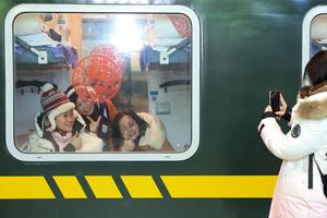 (260119) -- HARBIN, 19 enero, 2026 (Xinhua) -- Turistas extranjeros posando para una fotografía en el K7041, un tren temático sobre la cultura popular del noreste de China, en la provincia de Heilongjiang, en el noreste de China, el 19 de enero de 2026. Recientemente, turistas de países del Sudeste Asiático han acudido en masa a Harbin, aclamada como la "Ciudad de Hielo" de China, con un entusiasmo sin precedentes. (Xinhua/Xu Shuai) (oa) (ah) (vf)