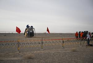 (260119) -- SITIO DE ATERRIZAJE DE DONGFENG, 19 enero, 2026 (Xinhua) -- La cápsula de retorno de la nave espacial Shenzhou-20 es vista en el sitio de aterrizaje de Dongfeng, en la región autónoma de Mongolia Interior, en el norte de China, en el 19 de enero de 2026. (Xinhua/Li Zhipeng) (rtg) (ah) (vf)