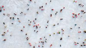 (260118) — YINCHUAN, 18 enero, 2026 (Xinhua) — Vista aérea tomada con un dron el 17 de enero de 2026 de personas divirtiéndose en una pista de hielo en un parque, en Yinchuan, en la región autónoma hui de Ningxia, en el noroeste de China. (Xinhua/Wang Peng) (oa) (da)