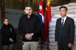 (260119) -- LA HABANA, 19 enero, 2026 (Xinhua) -- El vice primer ministro y ministro cubano del Comercio Exterior y la Inversión Extranjera, Oscar Pérez-Oliva Fraga (c), pronuncia un discurso durante una ceremonia de entrega, en La Habana, capital de Cuba, el 19 de enero de 2026. Cuba recibió de manera oficial el lunes el primer lote de un donativo de 30.000 toneladas de arroz de China, enviado como ayuda de emergencia para apoyar los esfuerzos destinados a garantizar el abastecimiento alimentario de la población de la isla caribeña. (Xinhua/Joaquín Hernández) (jh) (oa) (ah) (vf)