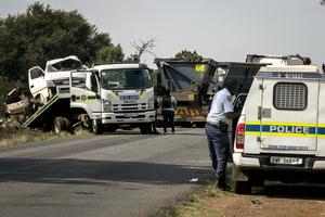(260119) -- JOHANNESBURGO, 19 enero, 2026 (Xinhua) -- Rescatistas limpian el sitio de un accidente, en Vanderbijlpark, en el sur de Johannesburgo, Sudáfrica, el 19 de enero de 2026. El número de muertos ascendió a 13 después de que un vehículo escolar colisionara con un camión la mañana del lunes en Vanderbijlpark, en el sur de Johannesburgo, en Sudáfrica, informaron medios locales. (Xinhua/Shiraaz Mohamed) (oa) (ah) (vf)