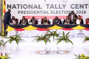 (260118) -- KAMPALA, 18 enero, 2026 (Xinhua) -- Imagen del 17 de enero de 2026 de funcionarios de la Comisión Electoral (CE) anunciando la victoria del presidente Yoweri Museveni en la elección presidencial 2026 en el Centro Nacional de Recuento de Votos, en Kampala, Uganda. El presidente en funciones de Uganda, Yoweri Museveni, ganó las elecciones presidenciales del país, informó el sábado la CE al dar a conocer los resultados definitivos en el Centro Nacional de Recuento de Votos, en la capital, Kampala. (Xinhua/Hajarah Nalwadda) (rtg) (da)