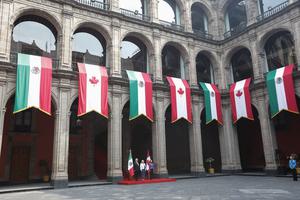 (260120) -- CIUDAD DE MEXICO, 20 enero, 2026 (Xinhua) -- La presidenta mexicana, Claudia Sheinbaum (d), sostiene una ceremonia de bienvenida para la gobernadora general de Canadá, Mary Simon (c), acompañada de su esposo, Whit Fraser (i), en Palacio Nacional, en la Ciudad de México, capital de México, el 20 de enero de 2026. (Xinhua/Francisco Cañedo) (fc) (jg) (ra) (vf)
