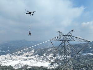 (260122) -- HEFEI, 22 enero, 2026 (Xinhua) -- Vista aérea tomada con un dron el 21 de enero de 2026 de un dron, manipulado por Gu Qingpu, elevando un dispositivo de deshielo hacia una línea eléctrica, en el distrito de Jinzhai, en la provincia de Anhui, en el este de China. Gu Qingpu y Li Wenke, dos trabajadores de mantenimiento energético de la Generación Z, trabajan las 24 horas para reportar datos críticos como temperatura, humedad, velocidad del viento y espesor de la capa de hielo. Deben iniciar inmediatamente la operación de deshielo en caso de formación de hielo severa. (Xinhua/Zhao Xianfu) (rtg) (ra) (vf)