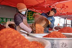 (260122) -- YINCHUAN, 22, enero 2026 (Xinhua) -- Imagen del 21 de enero de 2026 de vendedores preparando chile en polvo en el Mercado de Jingui, en el distrito de Helan de Yinchuan, en la región autónoma hui de Ningxia, en el noroeste de China. Fundado en 1957, el Mercado de Jingui abarca casi 50 mu (aproximadamente 3,33 hectáreas) y alberga a más de 400 vendedores que ofrecen una amplia gama de productos, desde ropa y comestibles hasta productos frescos y artículos de primera necesidad. Como un centro de negocios para más de 20 aldeas vecinas, facilita tanto las compras diarias como el comercio agrícola local. (Xinhua/Yang Zhisen) (da) (ra) (vf)