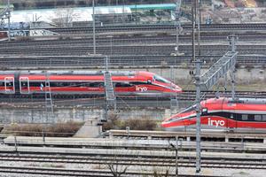 (260122) -- MADRID, 22 enero, 2026 (Xinhua) -- Imagen del 21 de enero de 2026 de dos trenes bala cruzándose cerca de la estación de Atocha, en Madrid, España. Adif, el administrador de la infraestructura ferroviaria estatal de España, anunció el martes la imposición de límites temporales de velocidad en ciertos tramos del tren de alta velocidad entre Madrid y Barcelona, después de que los conductores reportaran baches en la vía. (Xinhua/Gustavo Valiente) (da) (ra) (vf)