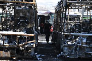 (260121) -- TEHERAN, 21 enero, 2026 (Xinhua) -- Una mujer permanece entre autobuses dañados durante los disturbios recientes, en Teherán, Irán, el 21 de enero de 2026. La televisión oficial iraní IRIB informó el miércoles que 3.117 personas murieron en los recientes disturbios registrados en el país, citando a la Organización Médica Forense del país. (Xinhua/Shadati) (ah) (ra) (vf)