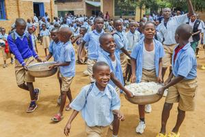 (260122) -- KIGALI, 22 enero, 2026 (Xinhua) -- Imagen del 20 de enero de 2026 de niños cargando platos de frijoles y arroz a sus salones de clases para almorzar en una escuela, en el distrito de Bugesera, en la provincia Oriental, en Ruanda. Bajo un programa de apoyo infantil lanzado en 2023, los niños aquí reciben alimentos en escuelas para atender sus problemas de nutrición. (Xinhua/Cyril Ndegeya) (rtg) (ra) (vf)