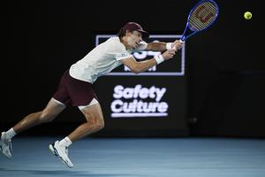 (260123) -- MELBOURNE, 23 enero, 2026 (Xinhua) -- Alex de Minaur devuelve la pelota durante el partido de tercera ronda de individuales masculinos entre Alex de Minaur, de Australia, y Frances Tiafoe, de Estados Unidos, en el torneo de tenis Abierto de Australia, en Melbourne, Australia, el 23 de enero de 2026. (Xinhua/Wang Shen) (oa) (ra) (vf)
