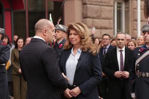 (260123) -- SOFIA, 23 enero, 2026 (Xinhua) -- Rumen Radev (i) conversa con Iliana Iotova frente al edificio presidencial, en Sofía, Bulgaria, el 23 de enero de 2026. La Corte Constitucional de la República de Bulgaria aprobó el viernes la dimisión del presidente búlgaro, Rumen Radev, que fue presentada el martes, anunció el tribunal en su página web. De acuerdo con la Constitución búlgara, la vicepresidenta del país, Iliana Iotova, deberá asumir la presidencia para lo que resta de mandato, que termina en enero de 2027. (Xinhua/Lin Hao) (jg) (rtg) (vf)