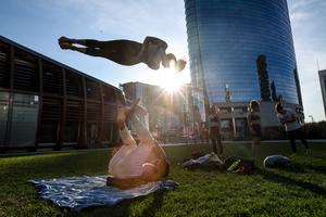(260124) -- MILAN, 24 enero, 2026 (Xinhua) -- Imagen del 17 de septiembre de 2025 de personas practicando yoga acrobático cerca del Bosco Verticale, en Milán, Italia. Los Juegos Olímpicos de Invierno Milán-Cortina 2026 se celebrarán del 6 al 22 de febrero. (Xinhua/Li Jing) (oa) (da)