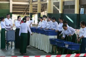 (260125) -- YANGON, 25 enero, 2026 (Xinhua) -- Funcionarios de la Comisión Electoral de la Unión cuentan los registros impresos de los votos durante la tercera fase de las elecciones generales en un centro de votación, en Yangón, Myanmar, el 25 de enero de 2026. La fase final de las elecciones generales multipartidistas y democráticas de Myanmar comenzó el domingo por la mañana, con la apertura de los centros de votación en alrededor de 60 municipios. (Xinhua/Myo Kyaw Soe) (rtg) (ah)