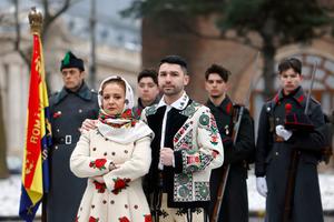 (260124) -- BUCAREST, 24 enero, 2026 (Xinhua) -- Rumanos portando trajes tradicionales asisten a una ceremonia para conmemorar el Día de la Unión de los Principados Rumanos, en Bucarest, Rumania, el 24 de enero de 2026. (Xinhua/Cristian Cristel) (jg) (da)