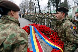 (260124) -- BUCAREST, 24 enero, 2026 (Xinhua) -- Soldados rumanos transportan una ofrenda floral durante una ceremonia para conmemorar el Día de la Unión de los Principados Rumanos, en Bucarest, Rumania, el 24 de enero de 2026. (Xinhua/Cristian Cristel) (jg) (da)