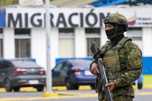 (260125) — TULCAN, 25 enero, 2026 (Xinhua) — Imagen del 24 de enero de 2026 de un soldado ecuatoriano vigilando frente a las oficinas de Migración en el paso fronterizo de Rumichaca, en la ciudad de Tulcán, en el norte de Ecuador. El presidente ecuatoriano, Daniel Noboa, anunció el pasado 21 de enero la decisión de Ecuador de aplicar una tasa de seguridad del 30 por ciento a productos procedentes de Colombia desde el 1 de febrero próximo, con el argumento de una supuesta falta de apoyo de Colombia en la lucha contra el narcotráfico en la frontera común. (Xinhua/Ricardo Landeta) (rl) (rtg) (da)