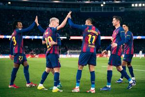 (260126) -- BARCELONA, 26 enero, 2026 (Xinhua) -- Imagen del 25 de enero de 2026 de jugadores de Barcelona, festejando una anotación durante el partido de fútbol de LaLiga entre Barcelona y Real Oviedo, en el Spotify Camp Nou, en Barcelona, España. (Xinhua/Joan Gosa) (oa) (ah) (vf)