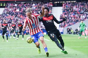 (260126) -- MADRID, 26 enero, 2026 (Xinhua) -- Imagen del 25 de enero de 2026 de Marcos Llorente (i), de Atlético de Madrid, disputando el balón con Johan Mojica, de RCD Mallorca, durante el partido de fútbol de La Liga entre Atlético de Madrid y RCD Mallorca, en Madrid, España. (Xinhua/Gustavo Valiente) (oa) (ah) (vf)