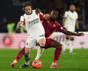 (260126) -- ROMA, 26 enero, 2026 (Xinhua) -- Imagen del 25 de enero de 2026 de Manu Koné (d), de Roma, disputando el balón con Luka Modric, de AC Milan, durante un partido de fútbol de la Serie A entre Roma y AC Milan, en Roma, Italia. (Xinhua/Alberto Lingria) (oa) (ah) (vf)
