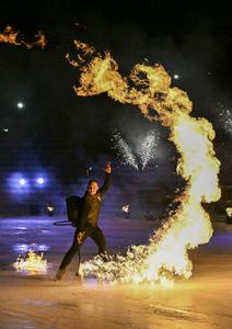 (260125) -- MOSCU, 25 enero, 2026 (Xinhua) -- Imagen del 24 de enero de 2026 de un artista realizando una presentación durante un espectáculo llamado "Hielo en llamas" en una pista de hielo de un parque, en Moscú, Rusia. (Xinhua/Hao Jianwei) (oa) (da)
