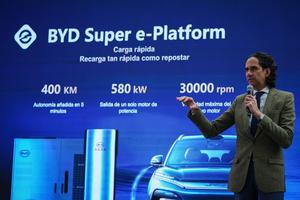 (260128) -- BOGOTA, 28 enero, 2026 (Xinhua) -- Imagen del 27 de enero de 2026 de Marco Pastrana, gerente general de Motorysa, distribuidora de BYD en Colombia, hablando durante la presentación de un informe del fabricante chino de autos BYD realizada en una de las sucursales, en Bogotá, capital de Colombia. El fabricante chino de autos BYD continúa liderando la transformación de la movilidad en Colombia con la venta de autos eléctricos y una estrategia de generar conciencia entre los consumidores sobre la necesidad de enfriar el planeta mediante el uso de energías renovables, según un informe reciente de la marca. (Xinhua/Andrés Moreno) (am) (ah) (ra) (vf)
