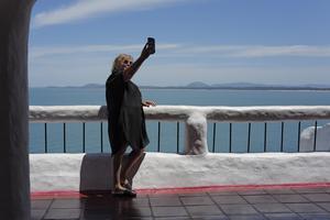 (260127) -- PUNTA DEL ESTE, 27 enero, 2026 (Xinhua) -- Imagen del 24 de enero de 2026 de de una mujer tomándose una fotografía en Casapueblo, en Punta del Este, en el departamento de Maldonado, Uruguay. En la emblemática península de Punta Ballena, frente al Río de la Plata, se alza Casapueblo. Más que una casa, es una "escultura habitable", el testamento en cemento y blanco del artista uruguayo Carlos Páez Vilaró. Desde su construcción en 1958, esta obra resumen la vocación universal de su creador. Hoy, guarda entre sus muros curvos un vínculo singular con China, forjado hace dos décadas. (Xinhua/Wang Zhongyi) (nc) (oa) (ah) (vf)