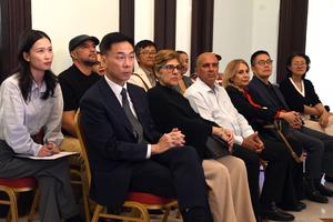 (260128) -- LA HABANA, 28 enero, 2026 (Xinhua) -- Imagen del 27 de enero de 2026 del embajador de China en Cuba, Hua Xin (i-frente), y personal periodístico de Cubavisión Internacional y CGTN en Español observando la serie documental "Rumbo al Este: Cuba y China, hermanos en el tiempo" en la Embajada de China, en La Habana, capital de Cuba. La serie documental "Rumbo al Este: Cuba y China, hermanos en el tiempo", producida por Cubavisión Internacional con la colaboración de CGTN en Español, fue presentada el martes en la Embajada china en La Habana. (Xinhua/Joaquín Hernández) (jh) (jg) (vf)