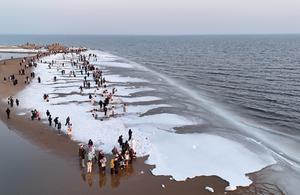 (260201) -- SHIJIAZHUANG, 1 febrero, 2026 (Xinhua) -- Vista aérea tomada con un dron el 31 de enero de 2026 de turistas visitando una playa cubierta de hielo marino, en el distrito de Beidaihe de Qinhuangdao, en la provincia de Hebei, en el norte de China. (Xinhua/Yang Shiyao) (oa) (da)