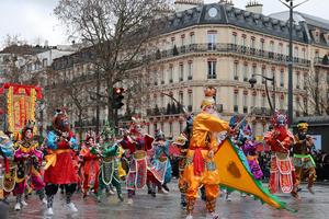 (260202) -- PARIS, 2 febrero, 2026 (Xinhua) -- Imagen del 1 de febrero de 2026 de artistas interpretando una danza Yingge durante un desfile para celebrar el próximo Año Nuevo chino en la avenida de los Campos Elíseos, en París, Francia. (Xinhua/Zhang Baihui) (oa) (ah) (vf)