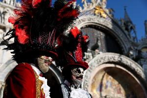 (260202) -- VENECIA, 2 febrero, 2026 (Xinhua) -- Imagen del 1 de febrero de 2026 de juerguistas posando en la Plaza de San Marcos durante el Carnaval de Venecia 2026, en Venecia, Italia. La edición de 2026 del tradicional Carnaval de Venecia se celebra del 31 de enero al 17 de febrero. (Xinhua/Li Jing) (oa) (ah) (vf)