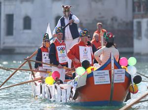 (260202) -- VENECIA, 2 febrero, 2026 (Xinhua) -- Imagen del 1 de febrero de 2026 de juerguistas vestidos con el tema del juramento Olímpico, durante el desfile acuático del Carnaval de Venecia, en Venecia, Italia. La edición de 2026 del tradicional Carnaval de Venecia se celebra del 31 de enero al 17 de febrero. (Xinhua/Li Jing) (rtg) (ah) (vf)