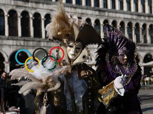 (260202) -- VENECIA, 2 febrero, 2026 (Xinhua) -- Imagen del 1 de febrero de 2026 de juerguistas vestidos con el tema de los Juegos Olímpicos posando durante el Carnaval de Venecia, en la Plaza de San Marcos, en Venecia, Italia. La edición de 2026 del tradicional Carnaval de Venecia se celebra del 31 de enero al 17 de febrero. (Xinhua/Li Jing) (rtg) (ah) (vf)