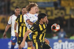 (260202) -- MONTEVIDEO, 2 febrero, 2026 (Xinhua) -- Imagen del 1 de febrero de 2026 del jugador Jesús Trindade (d), de Peñarol, disputando el balón con Lucas Rodríguez (i), de Nacional, durante el partido correspondiente a la final de la Supercopa Uruguaya, celebrado en el estadio Centenario, en Montevideo, capital de Uruguay. (Xinhua/Nicolás Celaya) (nc) (oa) (ah) (vf)