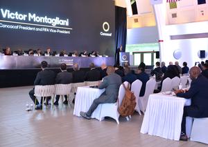 (260203) -- MANAGUA, 3 febrero, 2026 (Xinhua) -- Imagen del 1 de febrero de 2026 del presidente de la Confederación de Fútbol Asociación de Norte, Centroamérica y el Caribe (CONCACAF), Víctor Montagliani (d-atras), hablando durante el congreso número 41 de la CONCACAF, en Managua, Nicaragua. El congreso número 41 de la CONCACAF realizado el domingo en Nicaragua fortalecerá la colaboración entre los países miembros y afianzará los lazos de amistad en beneficio del deporte, consideró el delegado de la copresidencia nicaragüense, Maurice Ortega. (Xinhua/Noelia Aráuz) (fc) (jg) (ra) (vf)