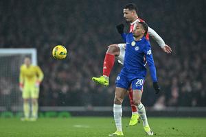 (260204) -- LONDRES, 4 febrero, 2026 (Xinhua) -- Imagen del 3 de febrero de 2026 de Joao Pedro (frente), de Chelsea, disputando el balón con William Saliba, de Arsenal, durante el partido de la semifinal de vuelta de la Copa de la Liga Inglesa de Fútbol entre Arsenal y Chelsea, en Londres, Reino Unido. (Xinhua) (ah) (ra) (vf) ***SOLO USO EDITORIAL*** ***NO A LA VENTA PARA CAMPAÑAS DE MARKETING O PUBLICIDAD. PROHIBIDO EL USO CON AUDIO, VIDEO, DATOS, LISTAS DE PARTIDOS, LOGOTIPOS DE CLUBES/LIGAS O SERVICIOS "EN VIVO" NO AUTORIZADOS. USO EN LINEA DURANTE EL PARTIDO LIMITADO A 45 IMAGENES, SIN EMULACION DE VIDEO. PROHIBIDO SU USO EN APUESTAS, PARTIDOS O PUBLICACIONES DE UN SOLO CLUB, LIGA O JUGADOR***