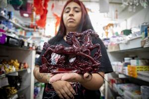 (260205) -- BUENOS AIRES, 5 febrero, 2026 (Xinhua) -- Una trabajadora sostiene una figura decorativa de dos caballos en un local comercial previo a la llegada del Año Nuevo chino, en el Barrio Chino de la ciudad Buenos Aires, capital de Argentina, el 5 de febrero de 2026. (Xinhua/Martín Zabala) (mz) (jg) (ah) (ra)