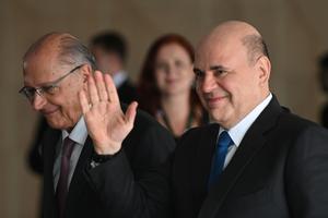 (260205) -- BRASILIA, 5 febrero, 2026 (Xinhua) -- El primer ministro ruso, Mikhail Mishustin (d), saluda a su llegada para asistir a la VIII Reunión de la Comisión de Alto Nivel de Cooperación Brasil-Rusia, en el Palacio de Itamaraty, en Brasilia, Brasil, el 5 de febrero de 2026. El vicepresidente de Brasil, Geraldo Alckmin, y Mishustin abrieron el jueves la VIII Reunión de la Comisión de Alto Nivel de Cooperación Brasil-Rusia, que tiene como objetivo fortalecer el comercio y la cooperación entre los dos países. (Xinhua/Lucio Tavora) (lt) (da) (ra)