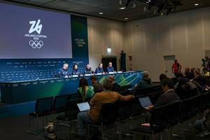 (260205) — MILAN, 5 febrero, 2026 (Xinhua) — El jefe de Relaciones con los Medios de la Agencia Mundial Antidopaje (WADA, por sus siglas en ingles), James Fitzgerald (i-atrás), el presidente de la WADA, Witold Banka (c-atrás), la vicepresidenta de la WADA, Yang Yang (2-i-atrás), el director general de la WADA, Olivier Niggli (2-d-atrás), y el presidente del equipo de Observadores Independientes de la WADA, Thomas Capdevielle, asisten a una conferencia de prensa en el centro de prensa principal de los Juegos Olímpicos de Invierno Milán-Cortina 2026, en Milán, Italia, el 5 de febrero de 2026. (Xinhua/Zhang Cheng) (da) (ra)