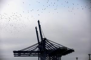 (260205) -- CHANCAY, 5 febrero, 2026 (Xinhua) -- Imagen del 2 de diciembre de 2025 de grúas en el puerto de Chancay, en Chancay, Perú. Las exportaciones de Perú a China se vieron potenciadas en 2025 debido a la puesta en marcha del puerto de Chancay, infraestructura que ha comenzado a generar un impacto en la conectividad logística del país andino hacia el mercado asiático, aseguró el jueves a Xinhua el experto peruano Juan Carlos Paz. (Xinhua/Mariana Bazo) (mb) (rtg) (ra)