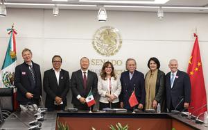 (260206) -- CIUDAD DE MEXICO, 6 febrero, 2026 (Xinhua) -- Imagen del 5 de febrero de 2026 de la presidenta de la Comisión de Relaciones Exteriores Asia-Pacífico del Senado de México, Yeidckol Polevnsky (c), el fundador y decano de la Escuela de Gobernanza Global del Instituto de Tecnología de Beijing, Liu Hao (3-i), el coordinador del Centro de Estudios China-México (Cechimex) de la Universidad Nacional Autónoma de México (UNAM), Enrique Dussel (i), y el coordinador del Programa Universitario de Gobierno de la UNAM, Eduardo Robledo (3-d), posando para una fotografía grupal durante la Conferencia Internacional México-China: Cooperación para el Desarrollo, celebrada en el Salón de Protocolo del Senado de México, en la Ciudad de México, capital de México. Legisladores, diplomáticos, académicos y empresarios de México y China coincidieron el jueves en la importancia de intensificar la cooperación bilateral entre ambas naciones, destacando su potencial para generar beneficios mutuos. (Xinhua/Francisco Cañedo) (fc) (jg) (da) (vf)