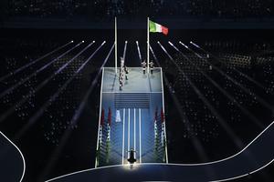 (260206) -- MILAN, 6 febrero, 2026 (Xinhua) -- La bandera nacional italiana es izada durante la ceremonia de inauguración de los Juegos Olímpicos de Invierno Milán-Cortina 2026 en el Estadio Olímpico San Siro, en Milán, Italia, el 6 de febrero de 2026. (Xinhua/Xue Yuge) (oa) (ra) (vf)